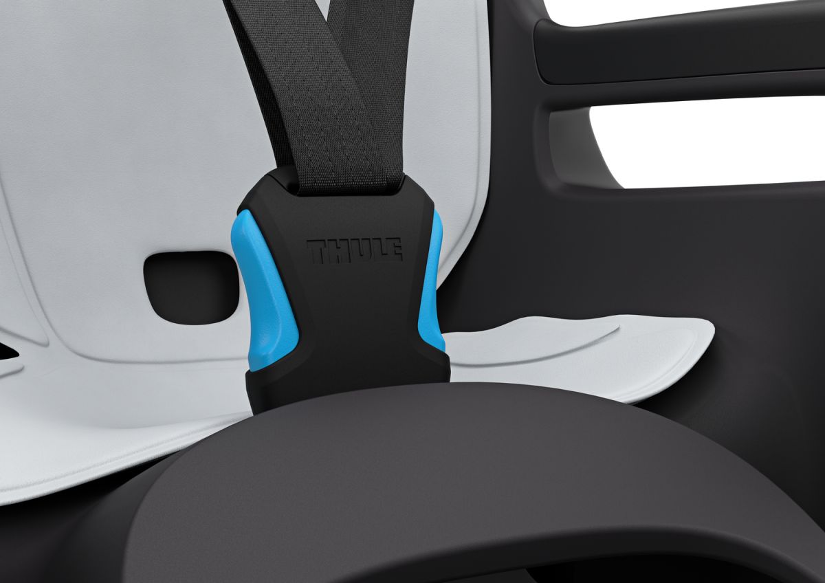 Tříbodový postroj s dětskou bezpečnostní přezkou a velkými tlačítky zajišťuje rychlé a snadné zapnutí. Integrovaná ochranná křídélka chrání ruce dítěte v situaci, kdy je kolo opřeno například o zeď. Komfort při jízdě zvyšuje měkké oboustranné polstrování, které je vodoodpudivé, odnímatelné a pratelné v pračce.