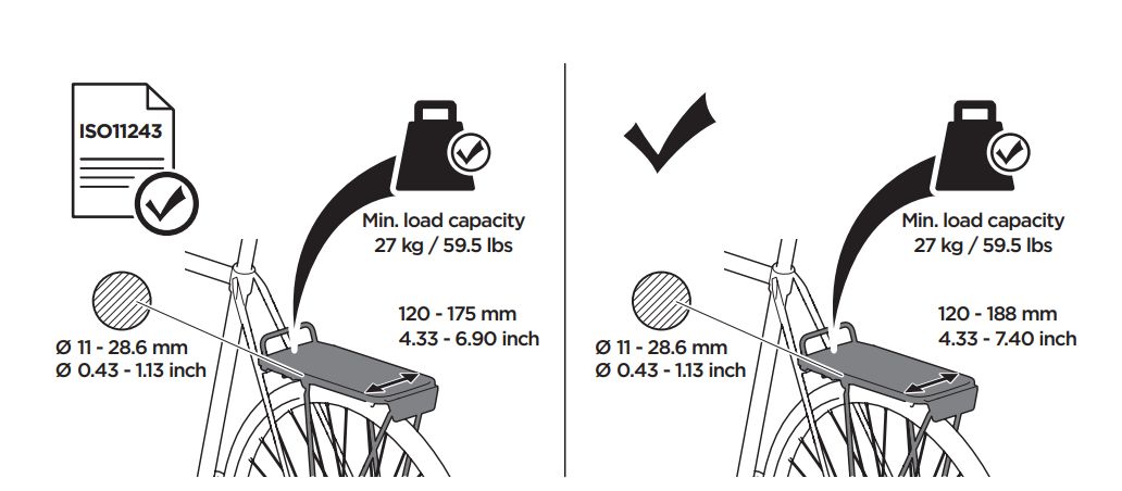 Lze ji rychle a bezpečně připevnit na většinu standardních zadních nosičů kol schválených pro zatížení až 27 kg.