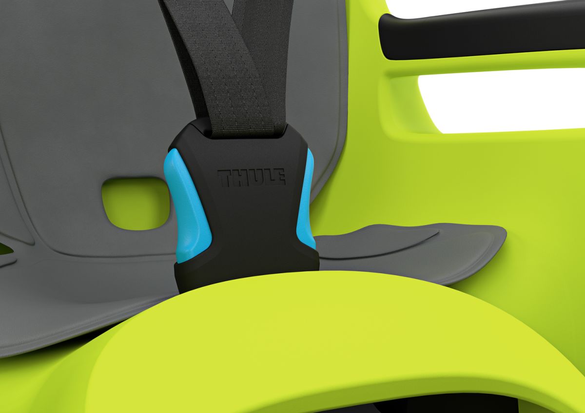 Tříbodový postroj s dětskou bezpečnostní přezkou a velkými tlačítky zajišťuje rychlé a snadné zapnutí. Integrovaná ochranná křídélka chrání ruce dítěte v situaci, kdy je kolo opřeno například o zeď. Komfort při jízdě zvyšuje měkké oboustranné polstrování, které je vodoodpudivé, odnímatelné a pratelné v pračce.