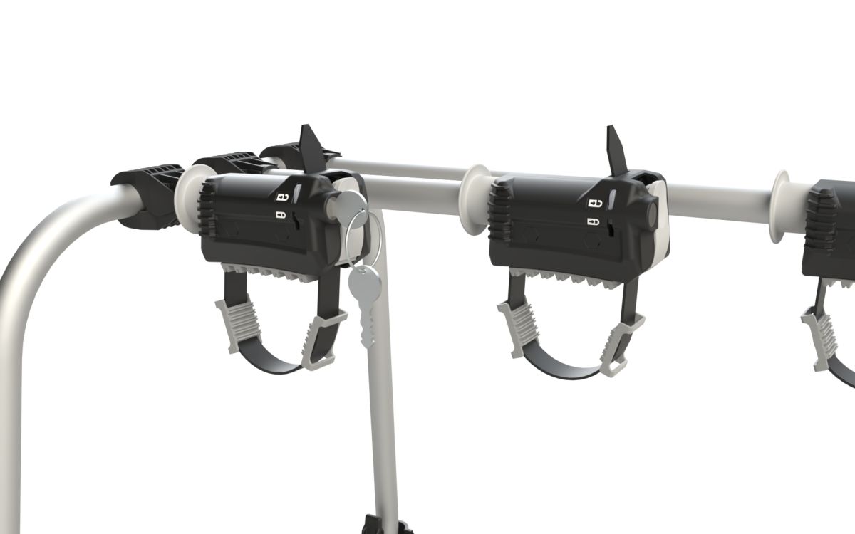 Promyšlená konstrukce umožňuje pevné sevření rámu o průměru 25 až 103 mm, přičemž fixační řemínek poskytuje vyšší bezpečnost proti vysmeknutí oproti klasickým čelistím. Integrovaná ráčnová přezka Double Way zajišťuje přesné a spolehlivé dotažení. Zakrytovaná koryta kol zvyšují stabilitu během přepravy a dodávají nosiči kompaktní vzhled. Upnutí kol probíhá pomocí dlouhých plastových pásků s ráčnovým mechanismem, které bez problémů obejmou i širší pneumatiky.