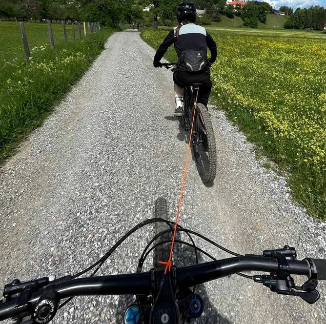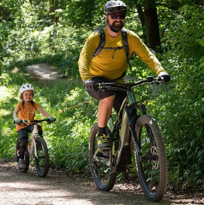 Samonavíjecí lano na tahání kola je praktický pomocník pro rodinné cyklistické výlety i náročnější trasy.
