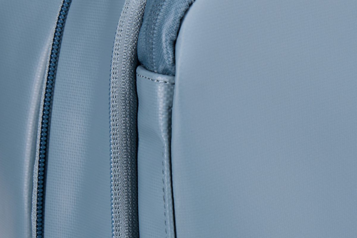 Robustní materiál z recyklovaného polyesteru s dvojitým potahem je vysoce odolný proti špíně, vlhkosti a mechanickému opotřebení. Zip má polyuretanovou úpravou pro dlouhou životnost.