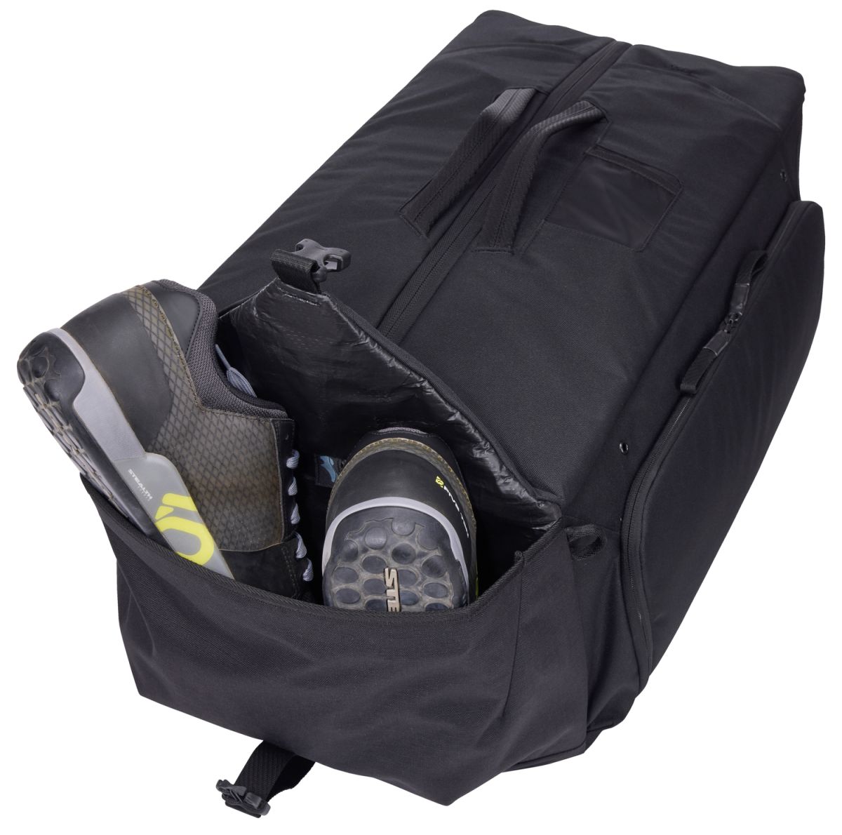 Široké otevírání s pružinovým rámem udržuje tašku otevřenou, což usnadňuje balení i orientaci uvnitř. Speciální kapsy pomáhají oddělit jednotlivé části výbavy. Praktická přihrádka na boty s nepromokavou vnitřní vrstvou umožňuje snadné čištění a zabraňuje přenosu nečistot na ostatní vybavení. Oddělený prostor chrání citlivé doplňky, jako jsou brýle, a další kapsy poskytují místo pro drobnosti, nářadí nebo energetické doplňky, které chcete mít vždy po ruce.
