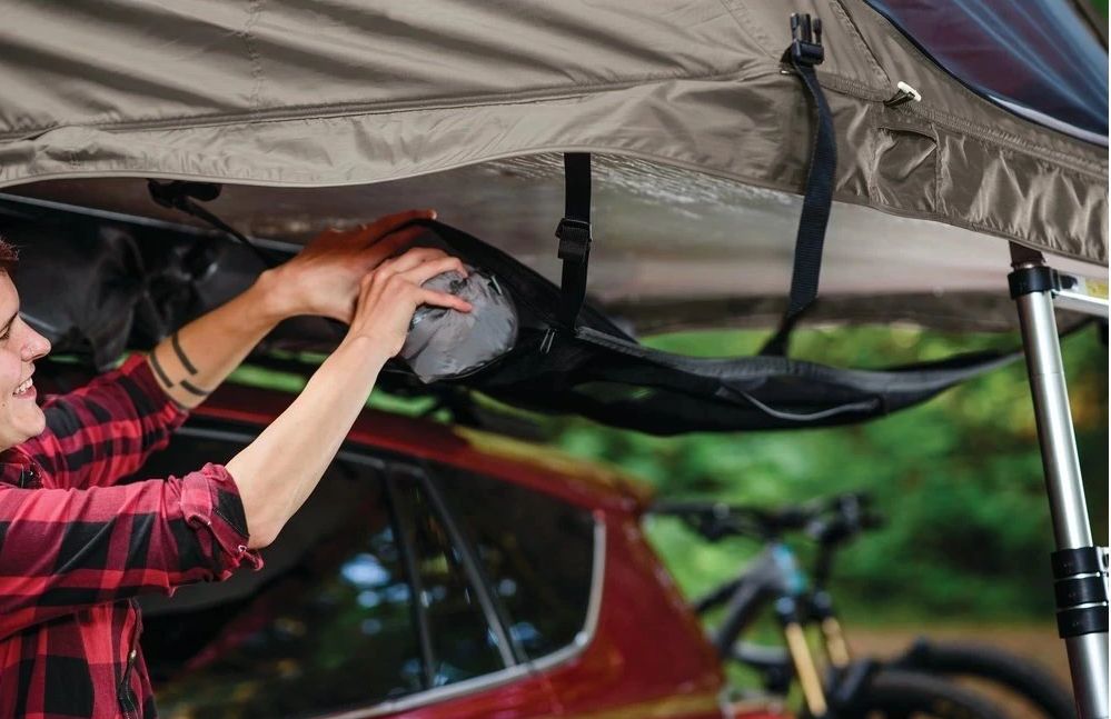 YAKIMA SkyRise SkyLoft je závěsná odkládací síťka navržená pro praktické uložení cestovních potřeb, oblečení nebo drobných předmětů během kempování.