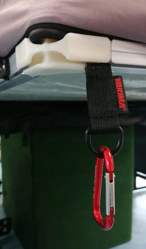 Karabinka se snadno zasune do kolejničky SideTrack™, která obíhá po obvodu stanu Yakima SkyRise, a můžete ji libovolně posouvat.